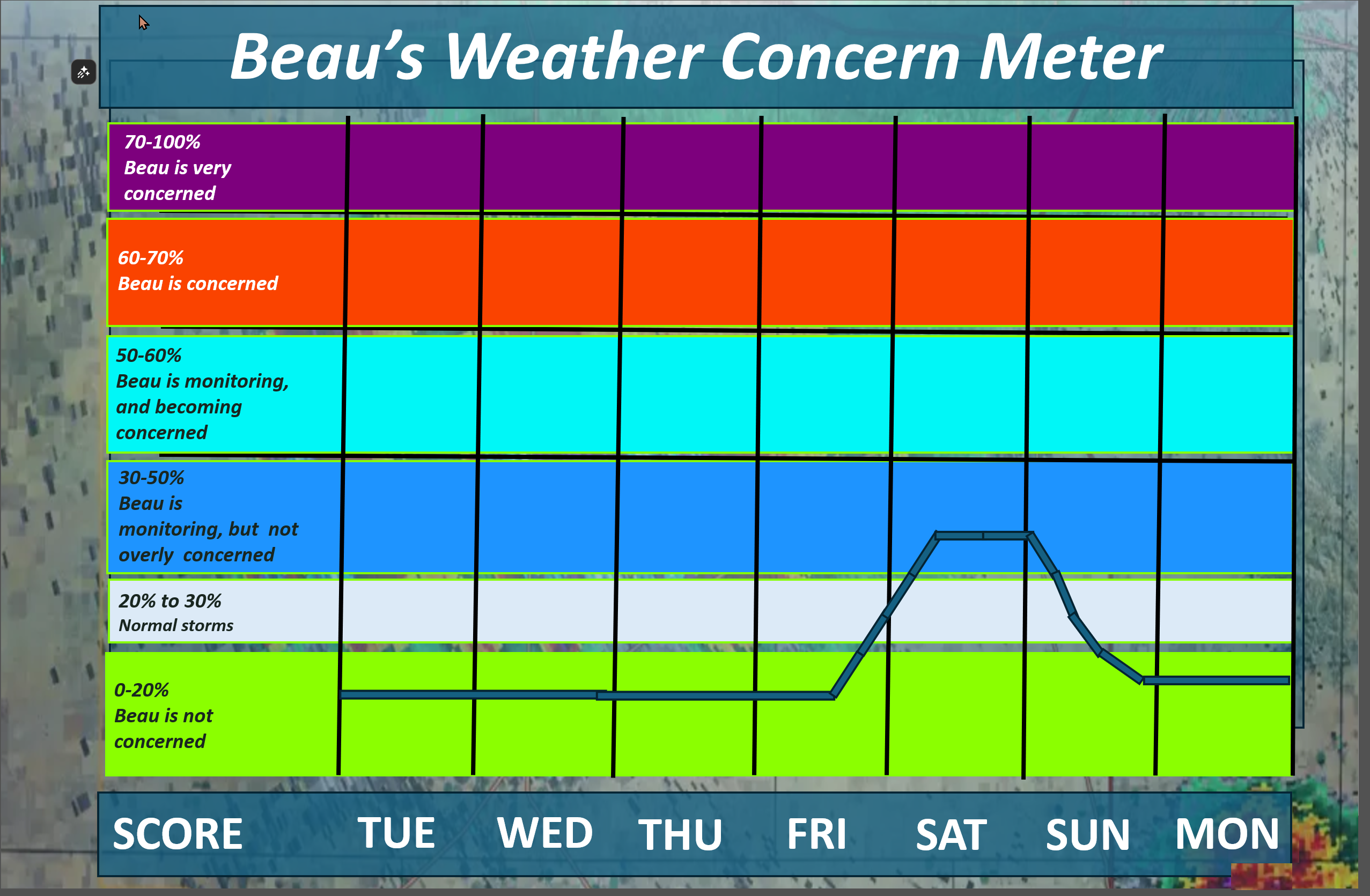 2. Are organized/widespread severe thunderstorms in the forecast? MONITOR. Severe thunderstorms are possible on Saturday and Saturday night.