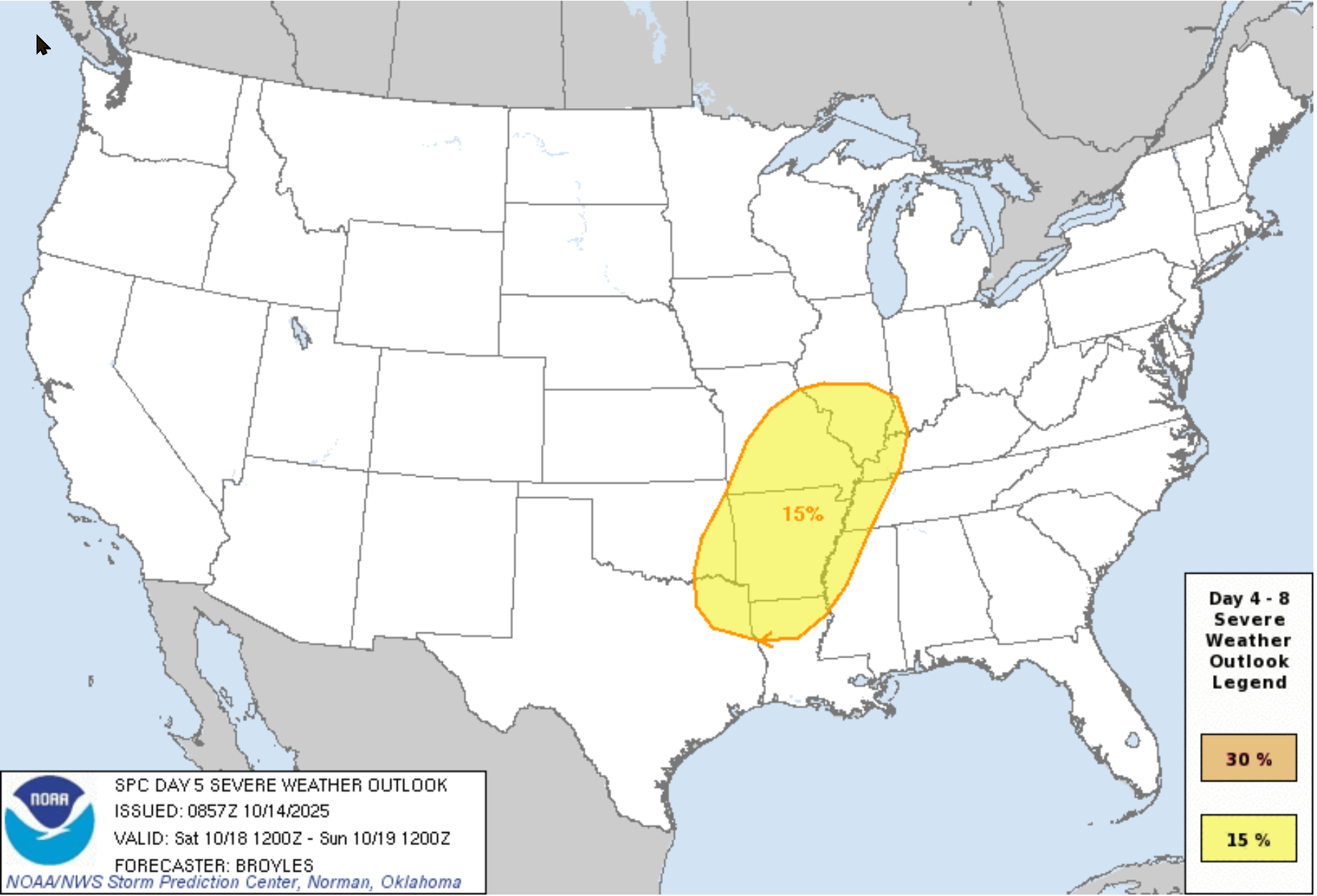 At this time, the Storm Prediction Center has outlined our region for a risk of severe thunderstorms on Saturday.