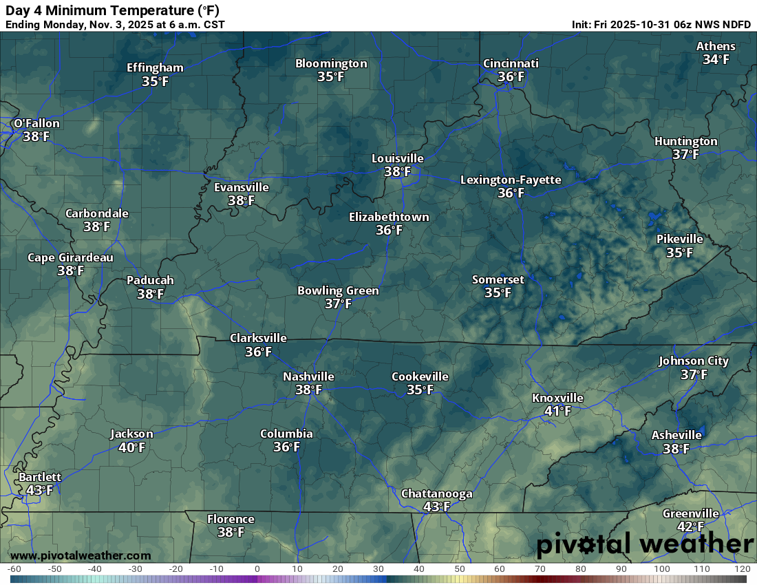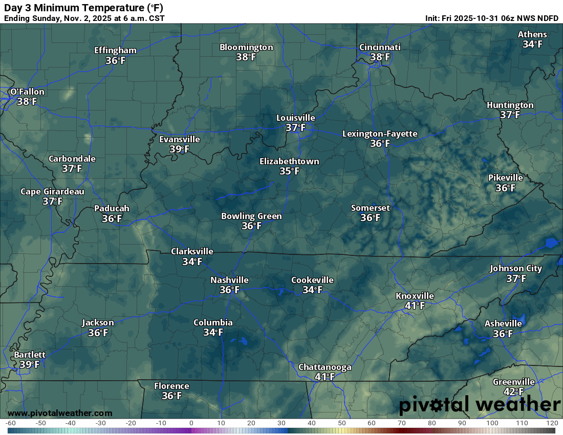 Areas that are typically colder could dip a few degrees lower than shown on this map. I can’t rule out some low to mid-30s on Sunday morning. Especially over northern portions of southeast Missouri and northern portions of southern Illinois.