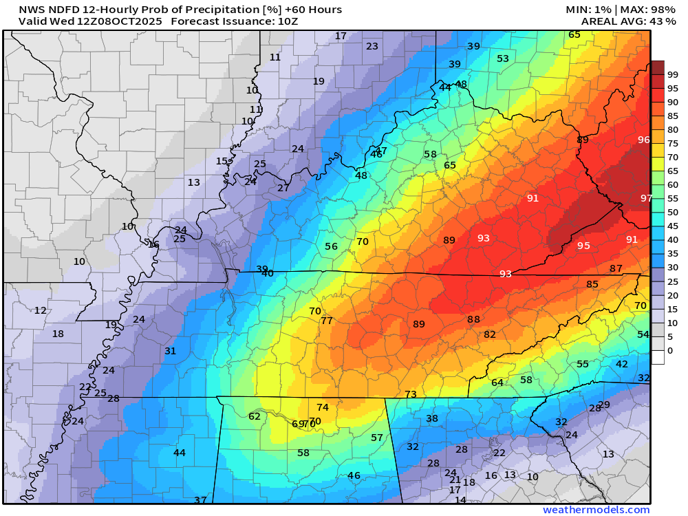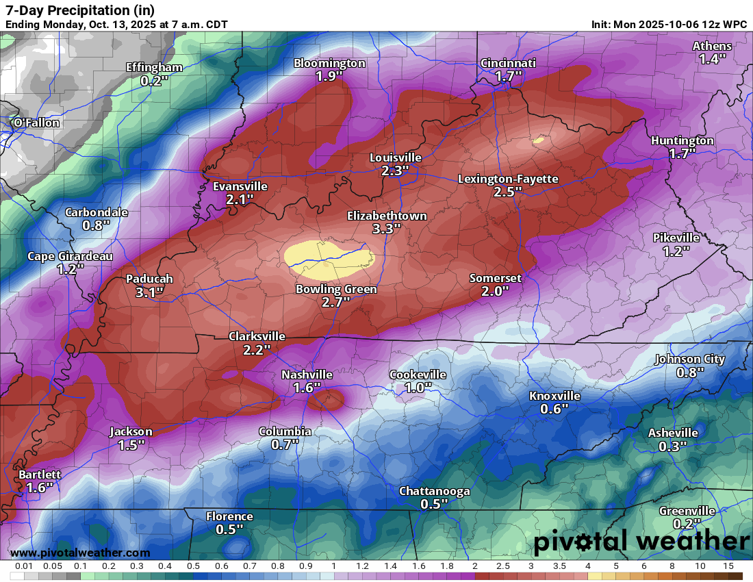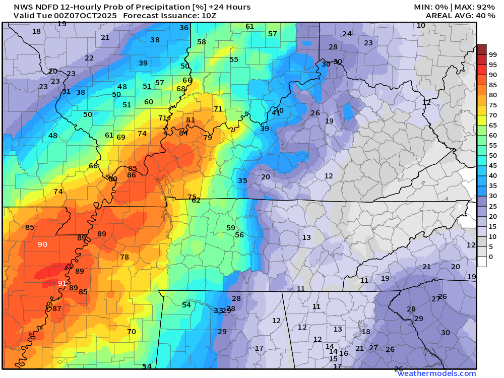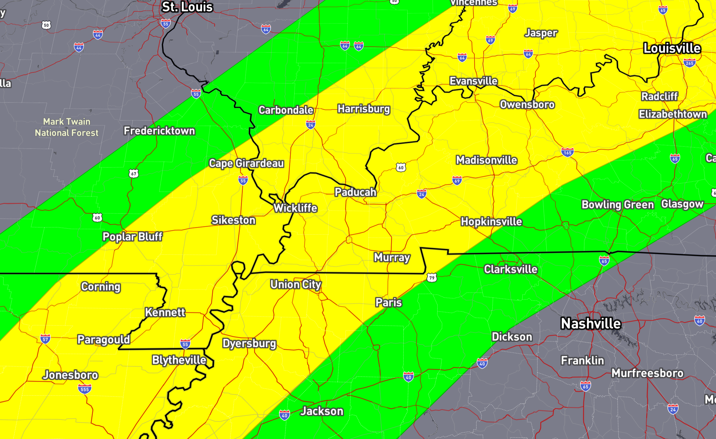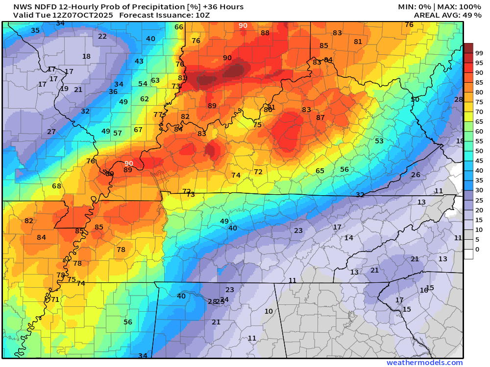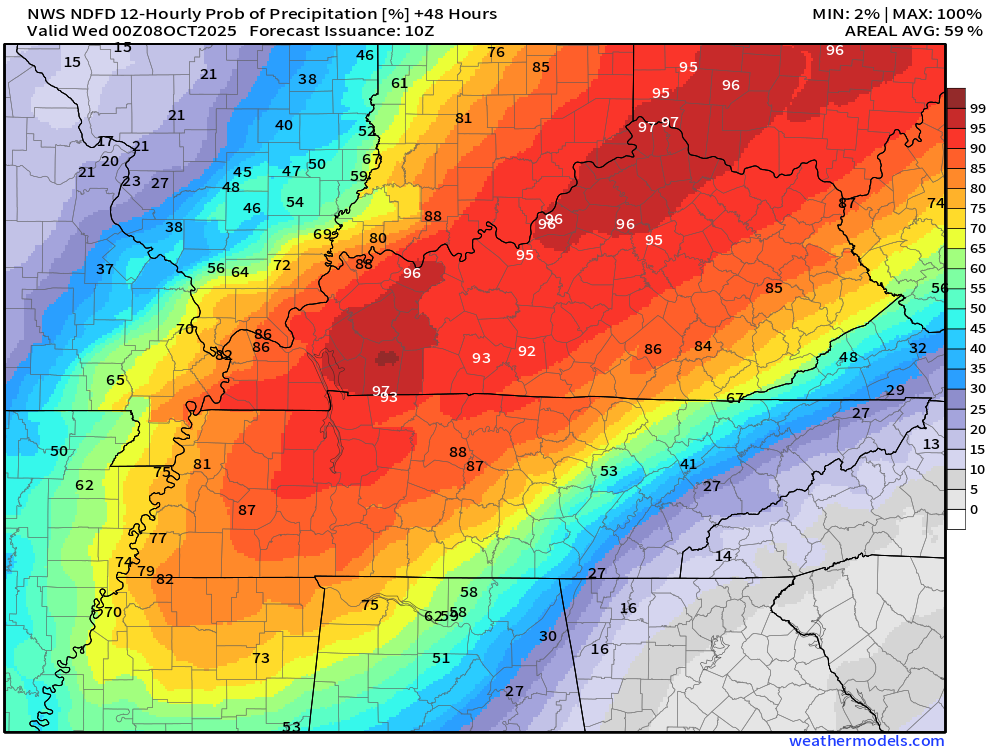 3. Is flash flooding in the forecast? SCATTERED. Some flash flooding issues are possible. The threat is a bit higher over western Kentucky and Tennessee vs Missouri and Illinois. Training showers and storms could enhance rainfall totals over the next 48 hours. Localized amounts above 2.50″ are possible. This could cause flooding of ditches, roadways, and streams. Avoid flooded roadways if flooding develops in some counties.