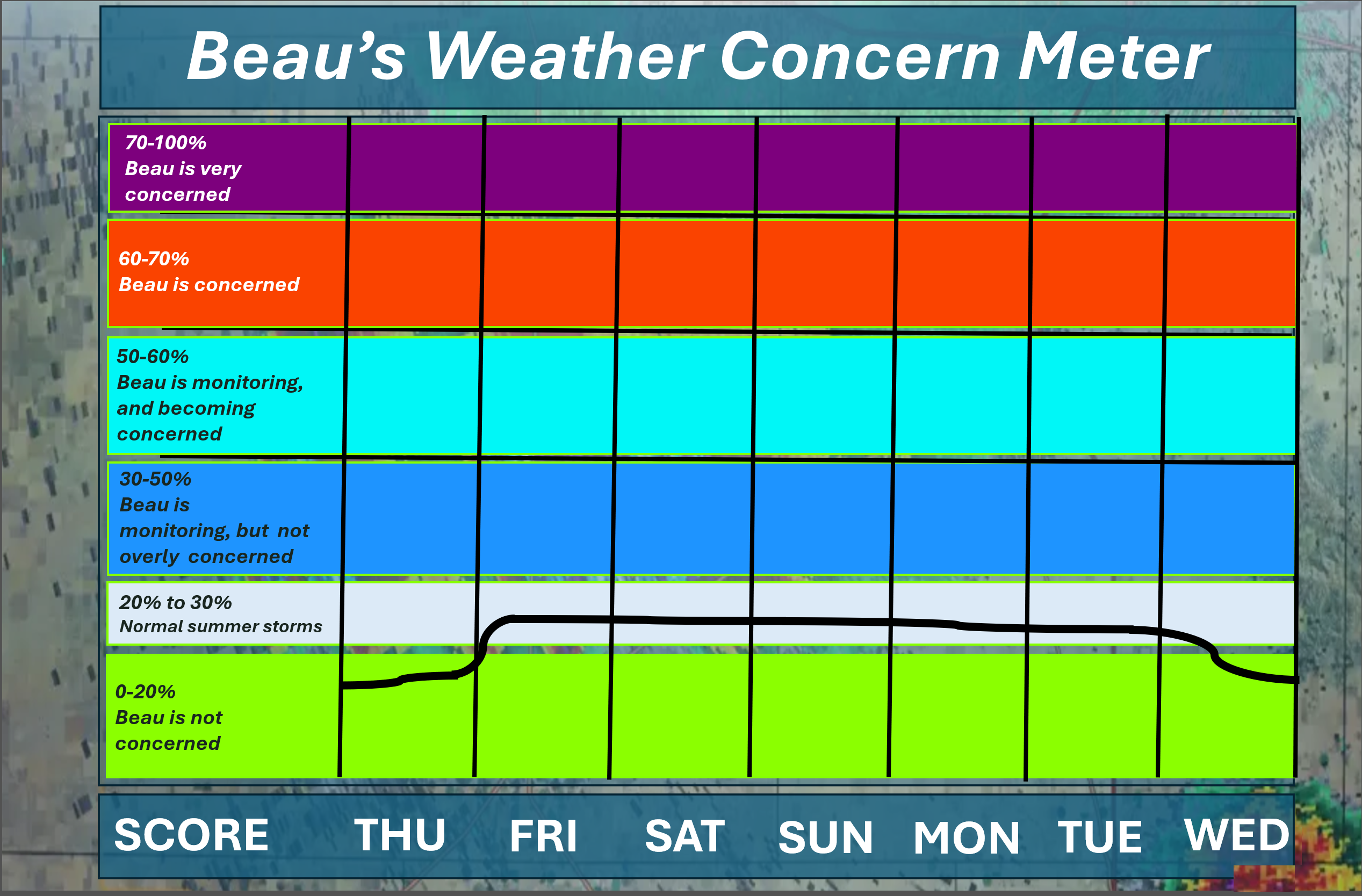 Rain chances will increase on Friday, Saturday, Sunday, Monday, and Tuesday. For now, I have peak chances on Monday and Tuesday. I did cap Monday and Tuesday’s chances at forty-perfect. Hopefully, those numbers increase.