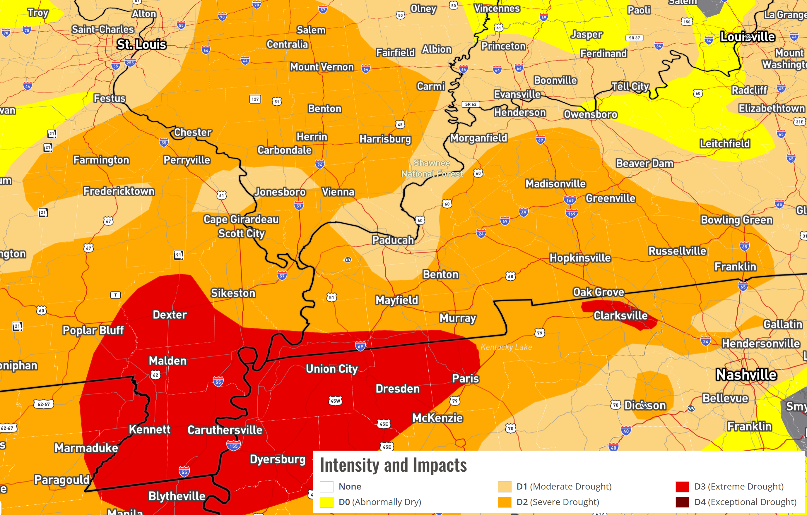 Southeast Missouri, Illinois, Kentucky, and Tennessee.
