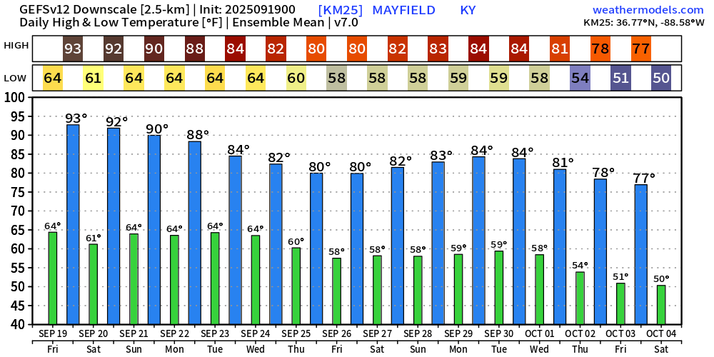 Here are the GFS ensemble temperatures.  This shows you the anticipated high and low temperatures.