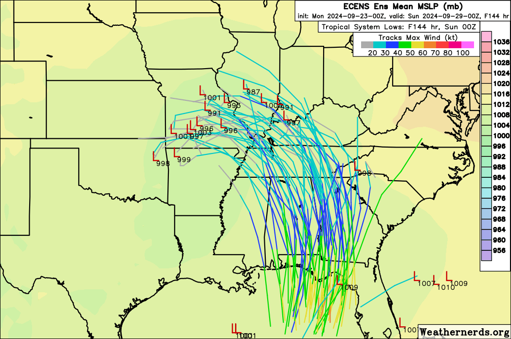 You can see the different model ideas on the track of the tropical system. Notice how a lot of the tracks curve northwest into our region. This does add some confidence that our upper level low will interact with tropical moisture.