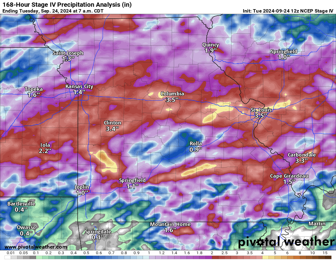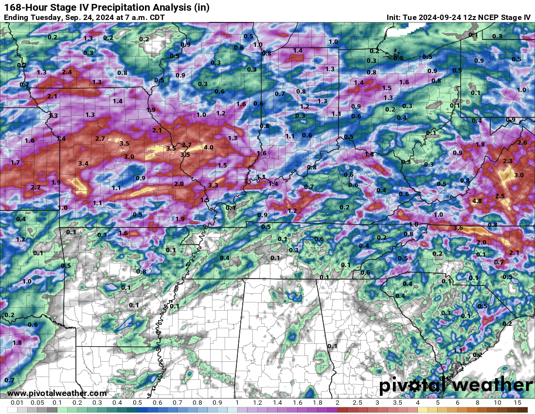 A few showers or thunderstorms will be possible over the southern half of the region this afternoon. Otherwise, deep mixing is expected with light winds and relative humidity dropping below 50%. The remnants of Tropical Storm Helene will begin to impact the region from east to west Thursday. Increasing northeast winds and relative humidity are expected. However, the Mark Twain should still see deep mixing and humidity dropping below 50%. Widespread heavy rainfall is expected Thursday night through Saturday. Scattered showers and storms will continue Sunday and Monday, before drying commences on Tuesday.