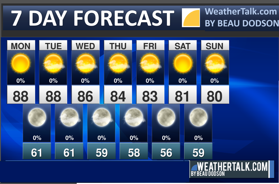 Then, temperatures are expected to drop slightly by Friday, Saturday, and Sunday. At that point, highs in the upper seventies and lower eighties will be the norm.