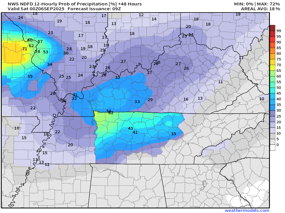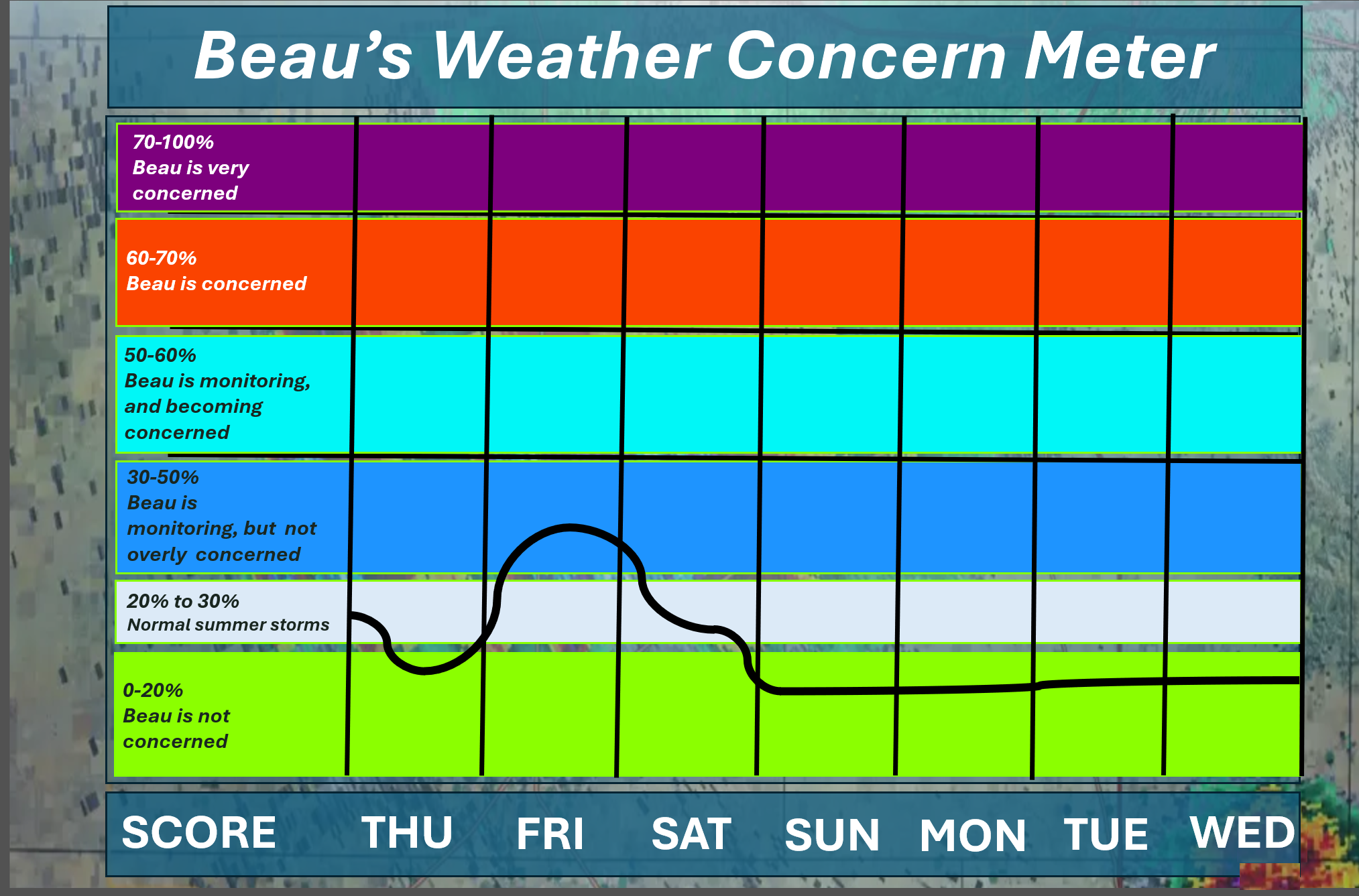 - Showers and storms are likely on Friday/Friday night into Saturday morning. I am semi-optimistic that some locations could exceed 0.50″. Some locations will receive little or no rainfall. Keep that in mind.