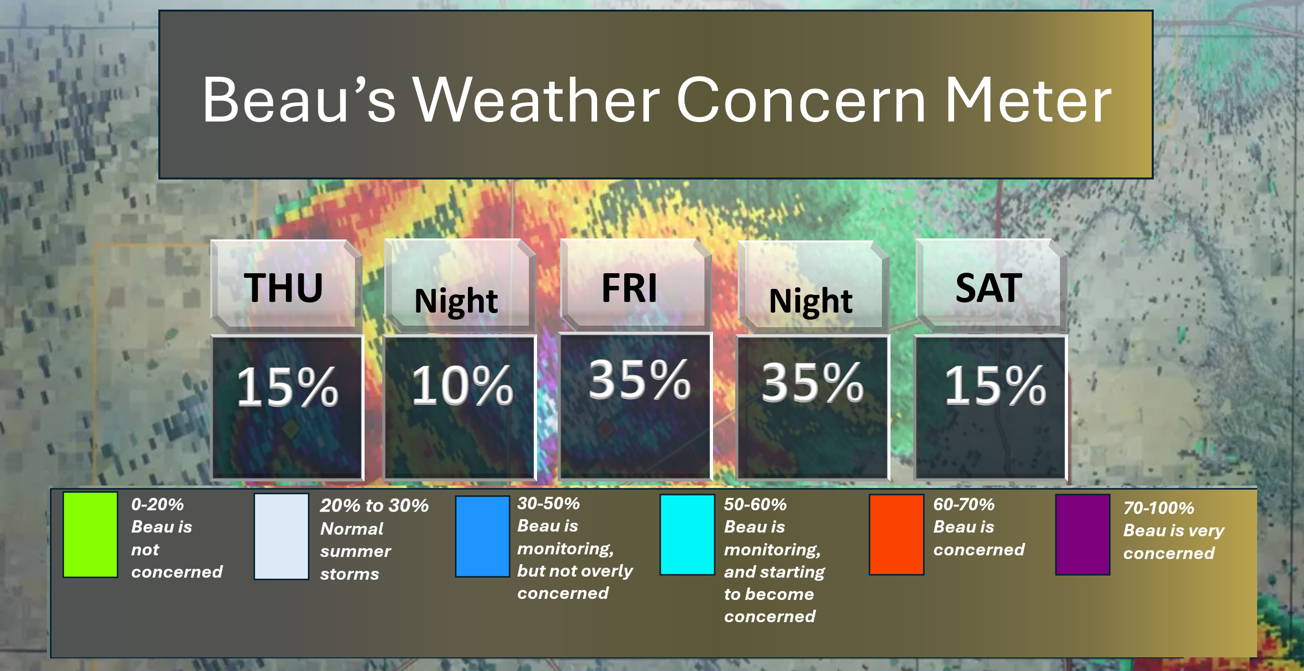 Some of those thunderstorms could be intense with strong wind gusts and quarter-sized hail. The tornado risk is very low. Monitor your Beau Dodson Weather App.