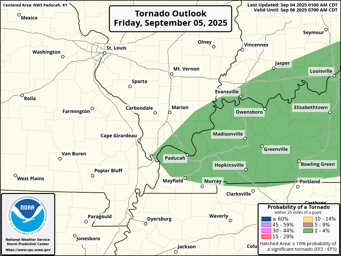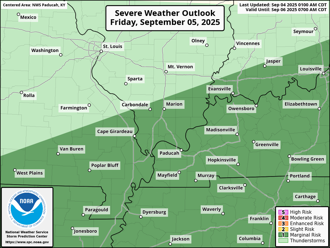 Comments: A few thunderstorms on Friday afternoon and evening could become severe. The Storm Prediction Center has added a very low risk of an isolated quick spin-up across portions of the region. Overall, the tornado risk is very low.