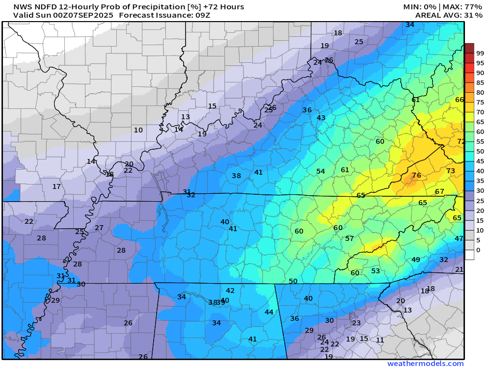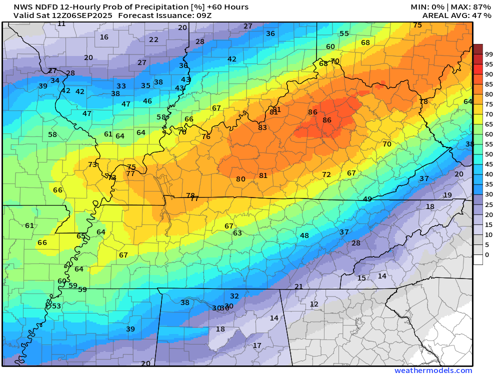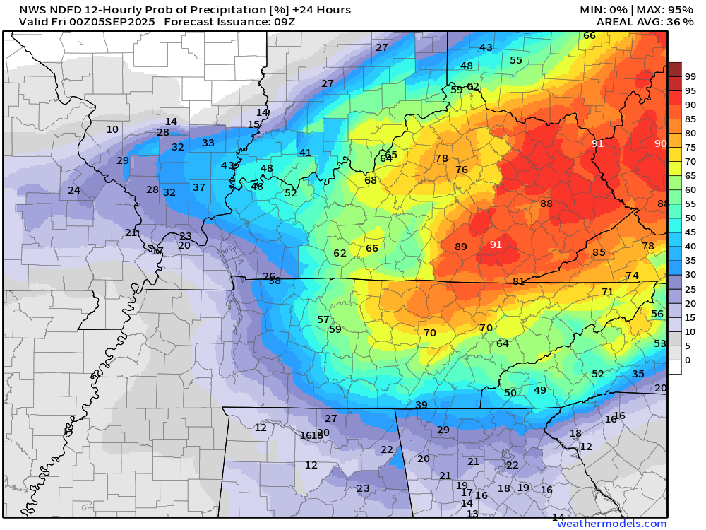 1. Is lightning in the forecast? YES. There is a chance of lightning this morning (mainly over western Kentucky). Lightning is likely on Friday afternoon and night. A smaller chance on Saturday.