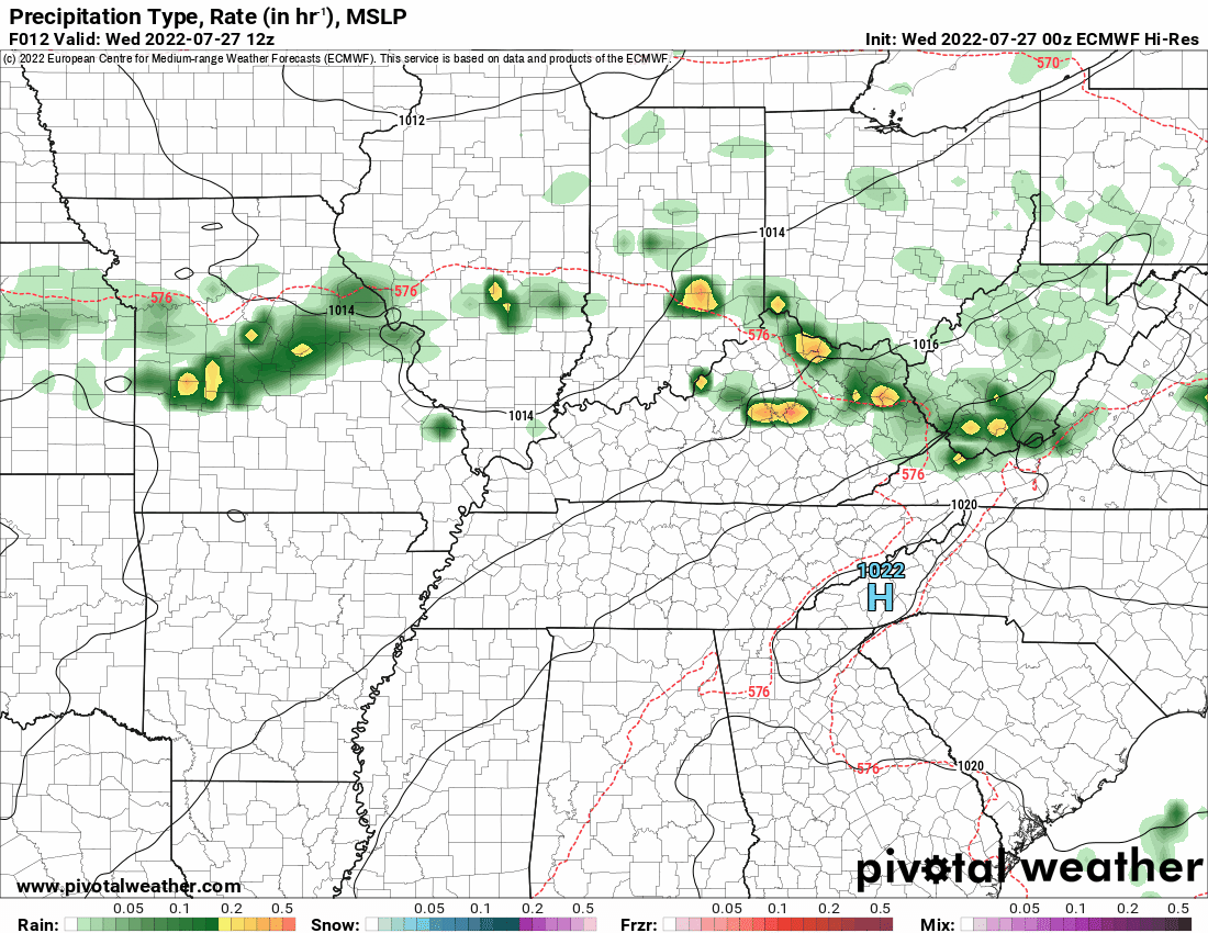 Temperature range: MO Bootheel 80° to 84° / SE MO 80° to 82° / I-64 Corridor of South IL 80° to 82° / South IL 80° to 82° / Northwest KY (near Indiana border) 80° to 82° / West KY 80° to 82° / NW TN 80° to 84°