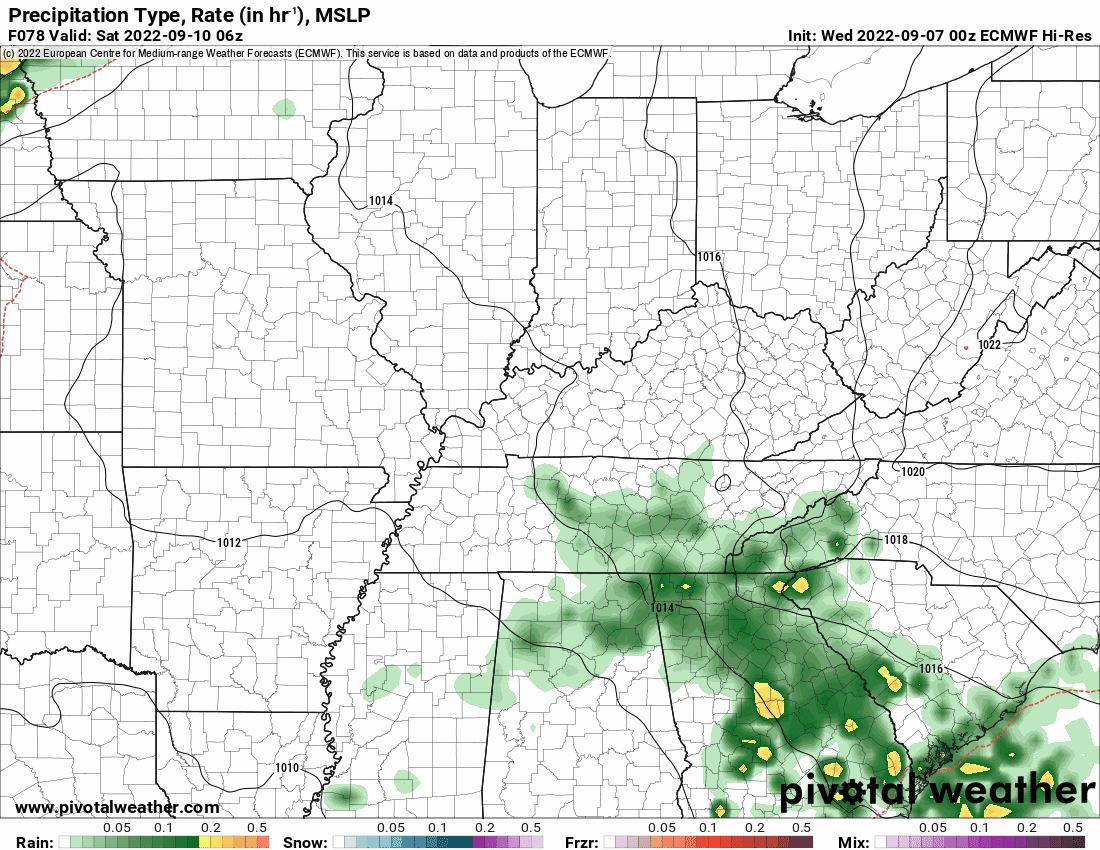 Friday Forecast: Patchy AM fog. Partly sunny. A chance of widely scattered showers and thunderstorms. Higher chances during the afternoon. The best chance of precipitation (which isn’t all that great to begin with) will be across Kentucky and Tennessee.